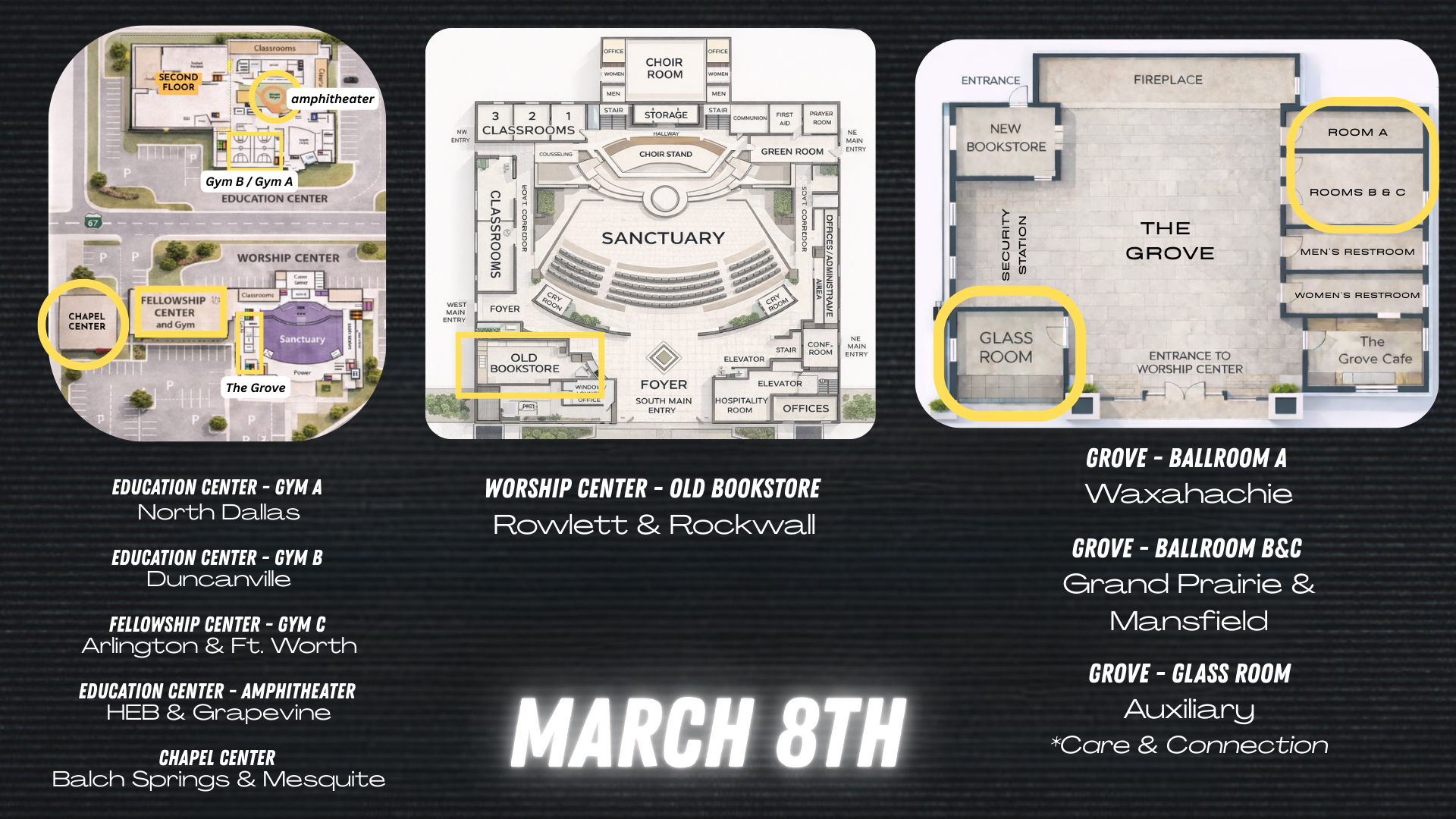 Kingdom Communities are groups of 8–12 members who meet regularly for Bible study in their neighboring zip code. Kingdom Community Leaders use an OCBF study guide to facilitate the studies.